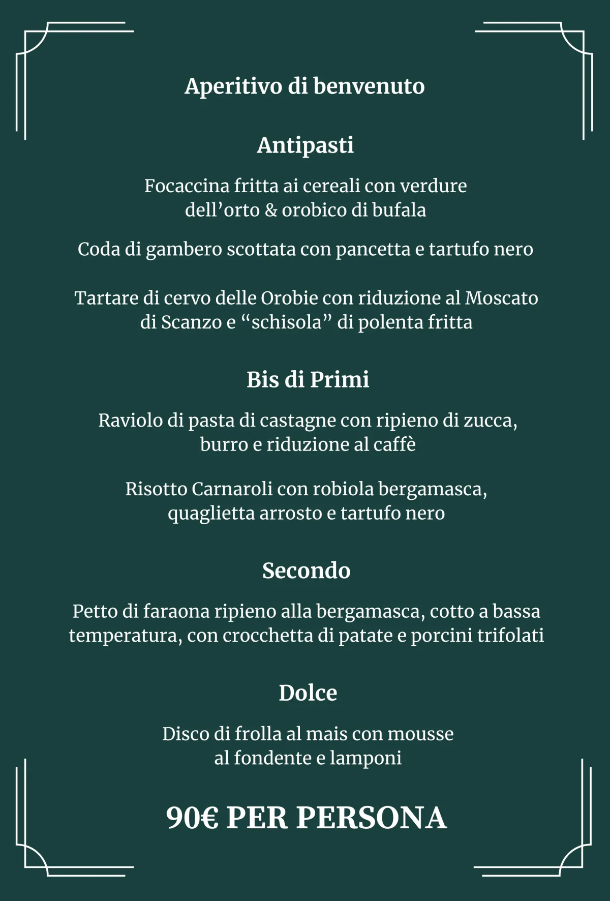 7 portate firmate dal nostro Chef Paolo Cavagnis, accompagnate da una selezione di vini della Cantina Martinelli di Scanzorosciate